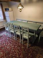 Kompletně vybavená kuchyň, lednice, 4 plot. el. sporák s troubou, mikrovlnka, varná konvice, kávovar, velký stůl, lavice, židle, rozkládací gauč. |